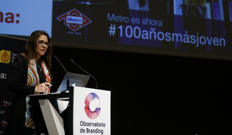 Con motivo del centenario del Metro de Madrid , y como eje vertebrador de la movilidad sostenible para el Madrid del siglo XXI, su directora de Marca y Medios, Sonia Aparicio, hizo hincapié en que “se trata de una marca vinculada a la historia, a la cultura, a la vida de millones de personas. Celebramos nuestro siglo de vida #100añosmásjoven”. El rombo rojo, blanco y azul de Metro Madrid es sin duda uno de los iconos de marca más reconocibles y apreciados por sucesivas generaciones de habitantes y visitantes de la Comunidad de Madrid.