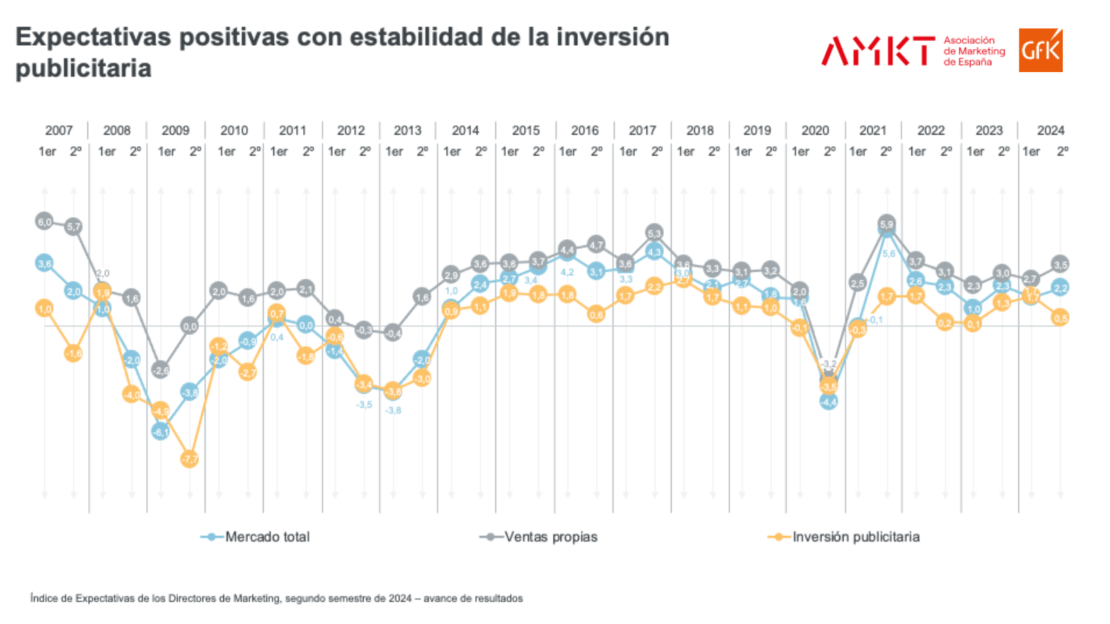 Después de un primer semestre, en el que las previsiones apostaban por la inversión económica como parte de la estrategia para incrementar las ventas, las previsiones de inversión publicitaria para este segundo semestre se moderan (+0,5). Para lo que queda de año, el índice retrocede 1,2 puntos, aunque se mantiene en valores positivos. Como razones para este comportamiento están los mayores esfuerzos realizados durante la primera mitad de 2024, o también, que los presupuestos destinados a estas actividades no se verán incrementados en los próximos meses.