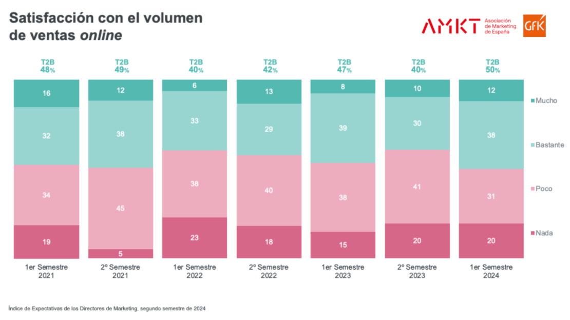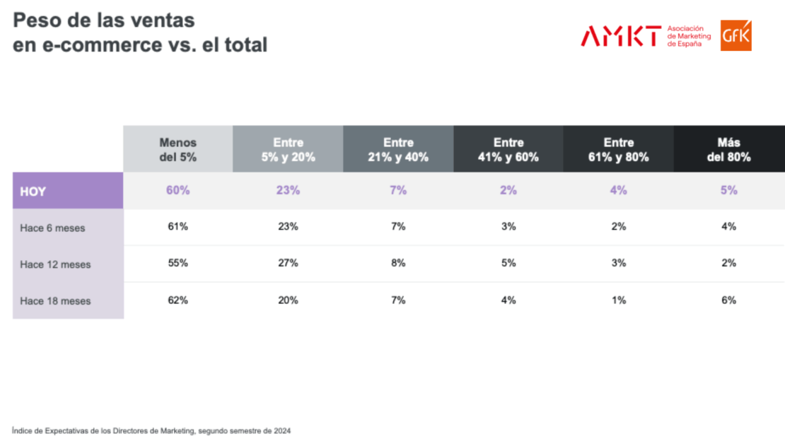 Otro de los aspectos analizados en el estudio es el relativo a los canales de venta, con foco especial en el canal online, analizando el peso de las ventas en e-commerce versus el total, o la satisfacción de las empresas con el volumen de ventas online que presentan. De este modo, los datos del estudio muestran que un 40 % de las empresas consultadas venden más de un 5 % de sus productos en plataformas online, y que el 50 % de los directores de Marketing se consideran satisfechos con este nivel de ventas, observándose un incremento en dicho indicador respecto a períodos anteriores.