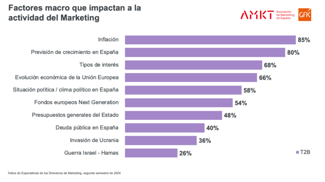 Asimismo, respecto a cuáles son los principales factores macro que impactan en la actividad del marketing, la inflación y las previsiones de crecimiento del país se muestran como los que mayor incidencia tienen, seguidos de los tipos de interés y de la evolución de la economía europea, resultados similares a los recogidos en la ola anterior del estudio.