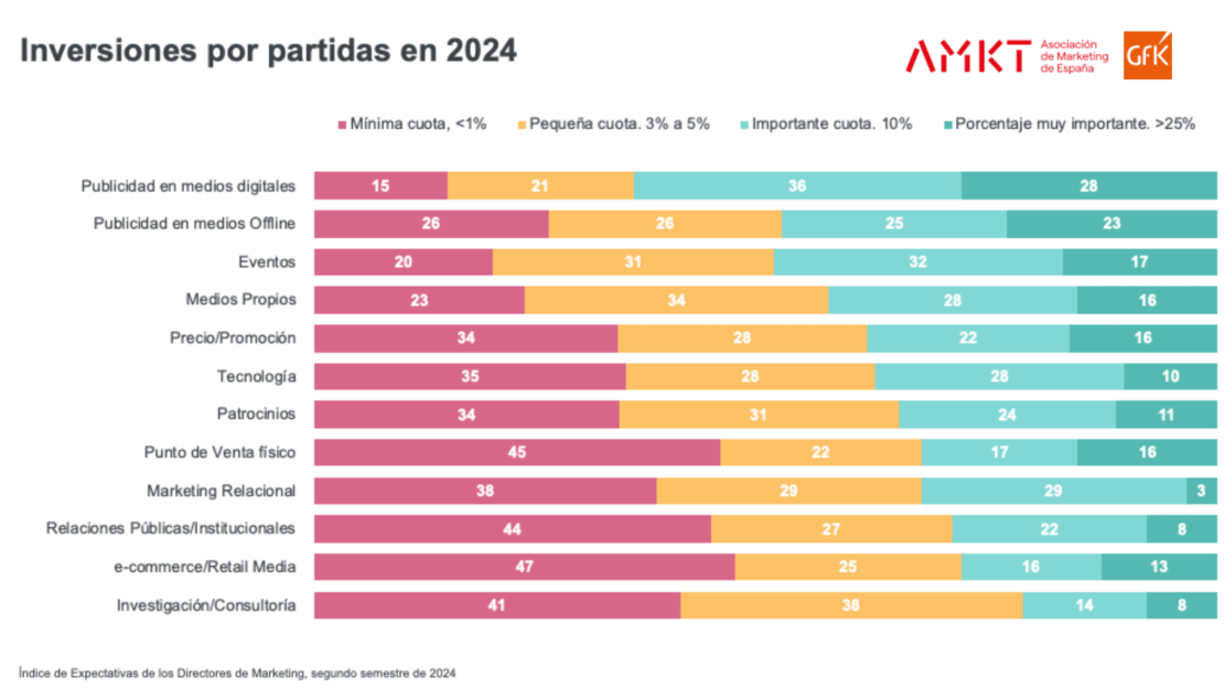 Profundizando en éste bloque del estudio, otro de los aspectos analizados es el tipo de acciones que concentrarán la mayor parte del presupuesto para lo que queda de año. En este sentido, los directivos consultados señalan que la inversión se concentrará principalmente en publicidad en medios digitales (28 %) y en publicidad en soportes tradicionales (23 %). A estas actividades, les siguen los eventos (17 %), medios propios, acciones en punto de venta y promociones, todos ellos con 16 % de las respuestas.