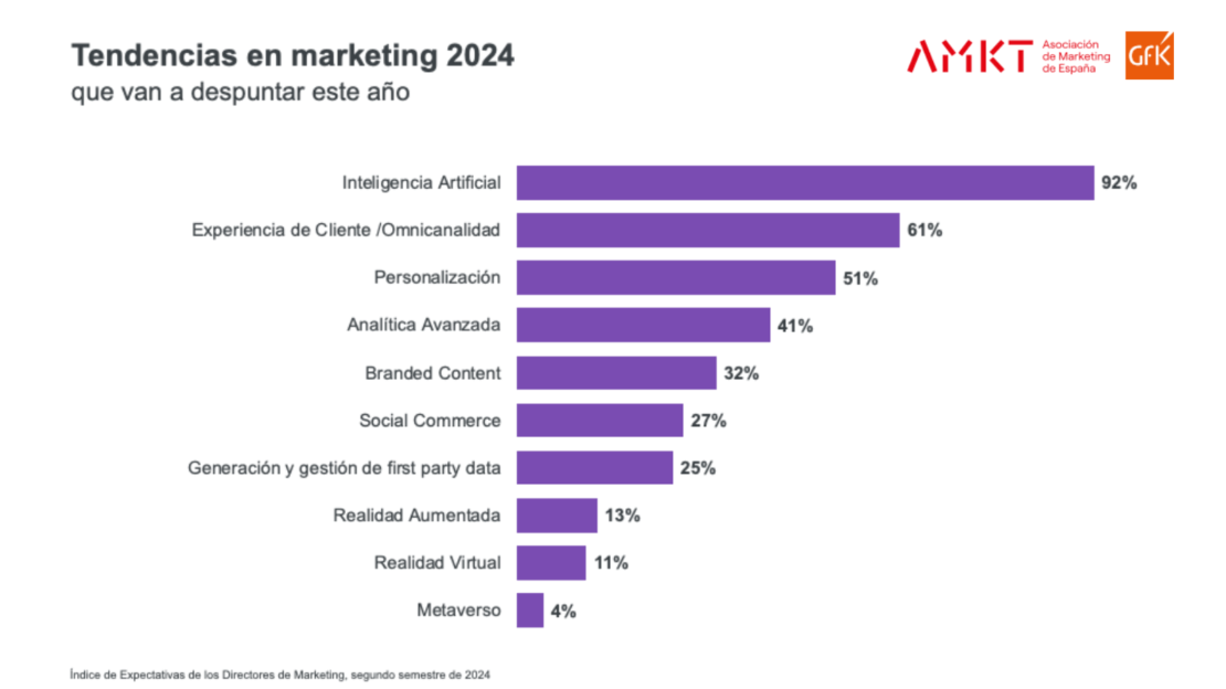 Por último, también se le pregunta a los directores de marketing sobre cuáles son las tendencias y factores que mayor incidencia van a tener en la actividad del Marketing, aspectos que complementan y contextualizan los datos del estudio. De este modo, entre las las tendencias que veremos desarrollarse con más fuerza están la inteligencia artificial (un 92 % los consultados apuntó a esta tecnología), seguida por las experiencias omnicanal (61 %), a las que siguen la personalización (51 %) y la analítica avanzada (41 %). A la cola quedaron la realidad aumentada (13 %), la realidad virtual (11 %) y el metaverso (4 %)