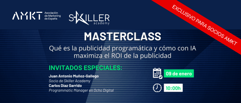 Llevamos a cabo la Masterclass «Qué es la publicidad programática y cómo maximizar el ROI con IA», una sesión exclusiva para socios AMKT, diseñada junto a nuestro socio Skiller Academy, para ofrecer una visión clara, práctica y accesible sobre cómo la compra automatizada de medios y la inteligencia artificial están transformando el rendimiento de las campañas.