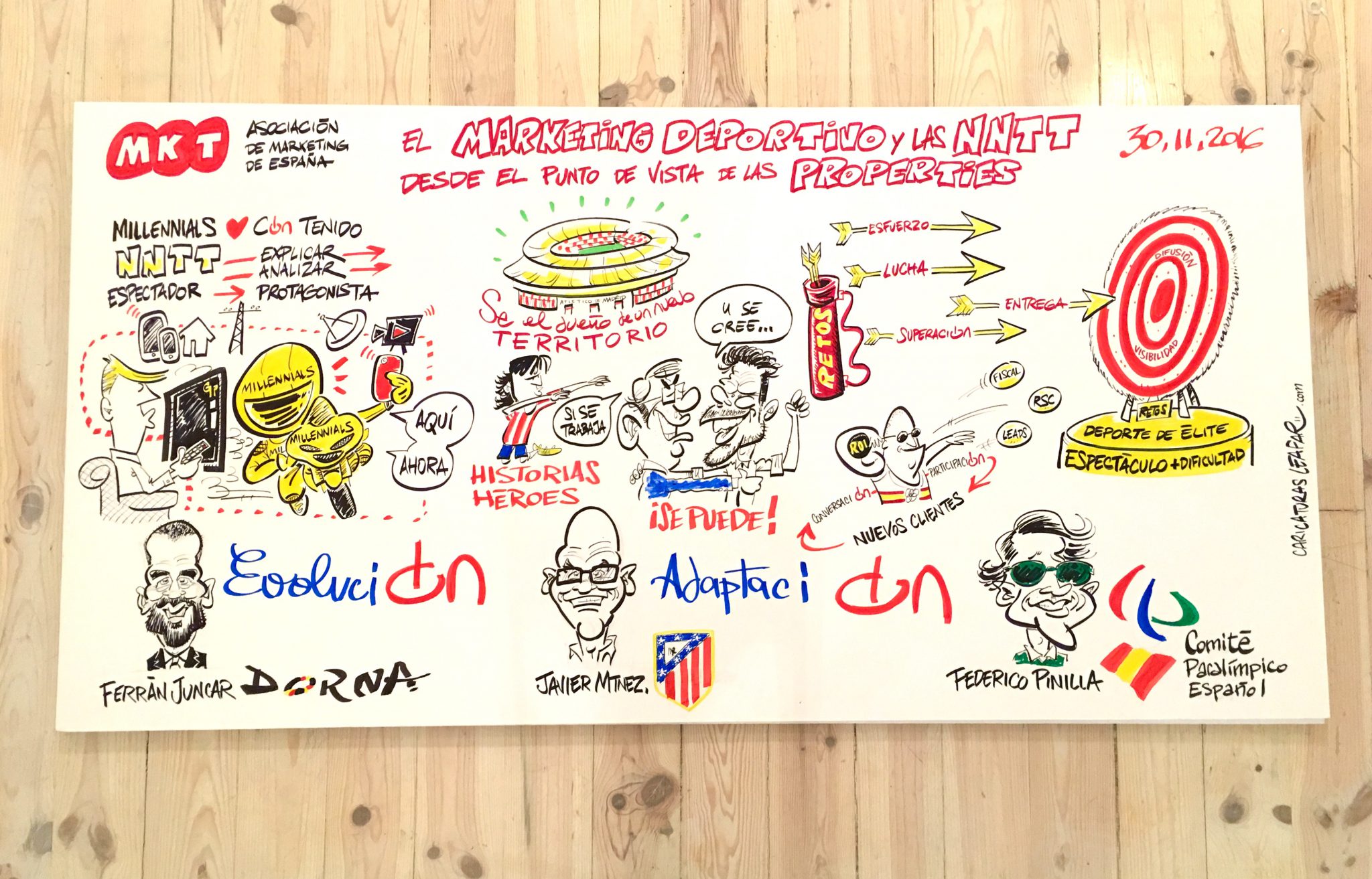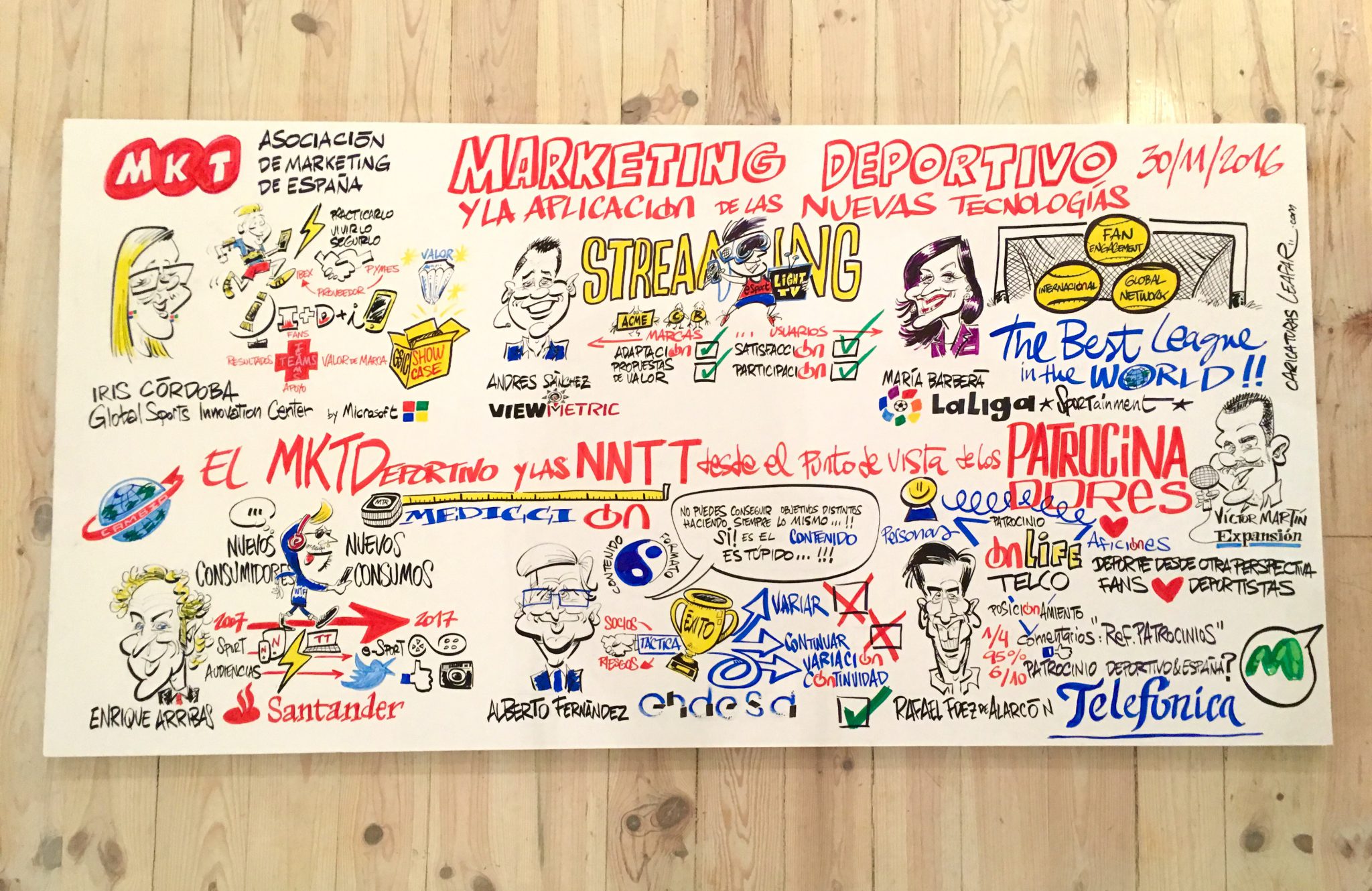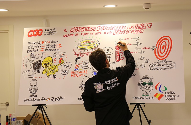 La Asociación de Marketing de España ha celebrado este jueves 30 de noviembre su I Jornada sobre Marketing Deportivo, que en esta ocasión ha girado en torno a la aplicación de las nuevas tecnologías en el sector. Haciendo un recorrido por algunos de los casos de éxito más destacados de grandes empresas, se ha analizado tanto el punto de vista de los patrocinadores como el de las properties. La jornada ha tenido lugar en el espacio Open Talk de Madrid y ha comenzado con un breve saludo de Víctor Conde, Director General de la Asociación de Marketing de España, que ha mostrado su agradecimiento a todos los presentes, ponentes y colaboradores, así como a Leafar Caricaturas, del que hemos podido disfrutar durante la jornada usando el visual thinking para plasmar el contenido de las ponencias en directo.