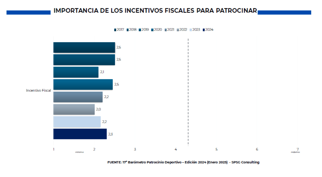 Esta afirmación se confirma tras analizar los resultados del estudio «Barómetro de Patrocinio Deportivo», que elabora anualmente SPSG Consulting, y en el que se resalta el hecho de que las marcas patrocinadoras, en una escala de 1 -mínima importancia- a 7 – máxima importancia-, otorgan, en los últimos 8 años, entre un 2 y un 3 a la importancia que dan a los incentivos fiscales en el proceso de decisión de patrocinar una determinada propiedad. Es decir, unos resultados que constatan el escaso interés que el sistema actual (tal como está planteado) depara en las marcas patrocinadoras.